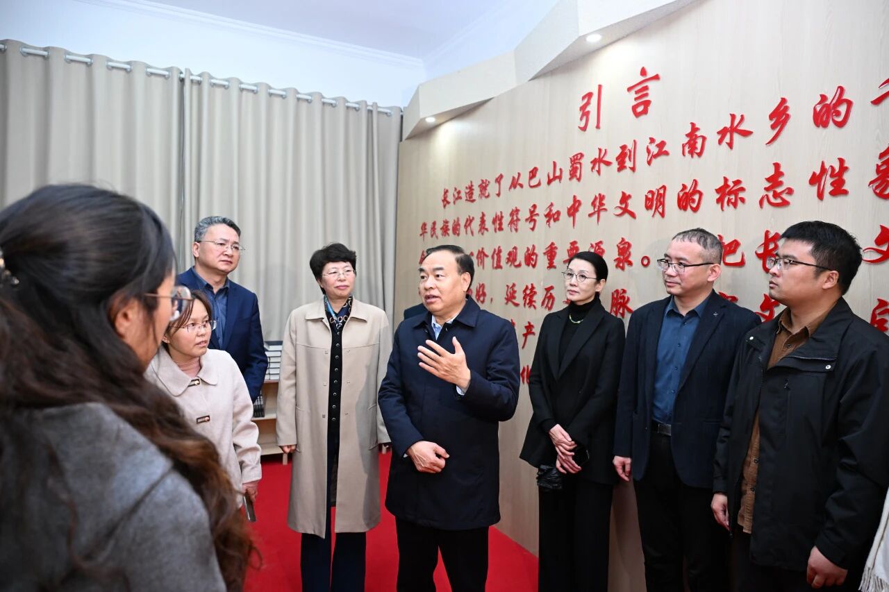 安庆是历史名城、戏曲之乡,也是安徽近现代高等教育的发源地。唐良智先后来到安庆师范大学敬敷书院、红楼等地,充分肯定了学校长期以黄梅戏文化、长江文化为研究对象开展学科建设所取得的丰硕成果。他指出,黄梅戏文化与长江文化交相辉映,共同彰显安徽文化魅力。要以更高站位、更宽视野、更大力度来挖掘和传承好这两大文化,强化学科建设,下大力气抓好人才培养、名家培育,推出更多经典的学术和文艺作品,增强文化传播力影响力。在安庆再芬黄梅公馆,唐良智为“省政协徽黄室研学交流基地”揭牌。他强调,要进一步丰富戏曲内容表达,强化戏曲形式创新,更积极拓展戏曲展演形态,把徽剧、黄梅戏文化名片擦得更亮。