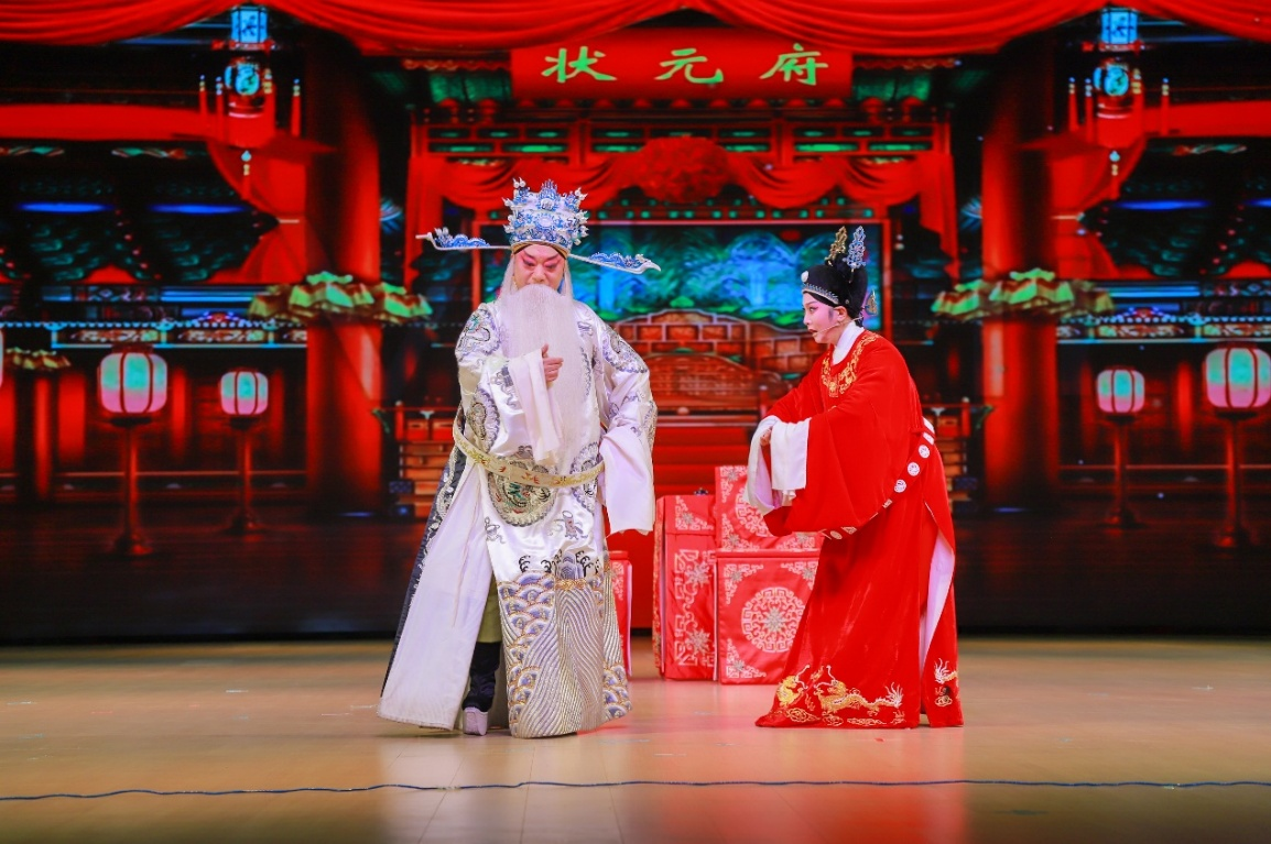 家喻户晓的《女驸马·状元府》作为压轴表演轰动全场,国家一级演员、黄梅剧艺术学院副院长刘国平与国家一级演员、黄梅剧艺术学院教师余淑华用饱满的感情、铿锵有力的唱腔,再现了冯素珍在状元府中巧妙应对刘大人的“大喜”,将冯素珍内心的忐忑与对爱情的坚守演绎得淋漓精致,不少观众沉浸其中,感受人物的喜怒哀乐。