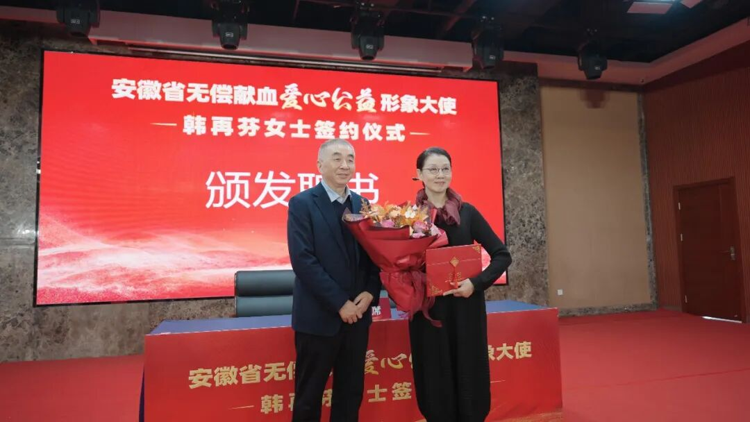 12月14日,安徽省无偿献血爱心公益形象大使聘任仪式在安徽省血液中心举行。黄梅剧艺术学院学术院长、著名黄梅戏表演艺术家韩再芬受聘担任“安徽省无偿献血爱心公益形象大使”,为家乡无偿献血公益事业助力。